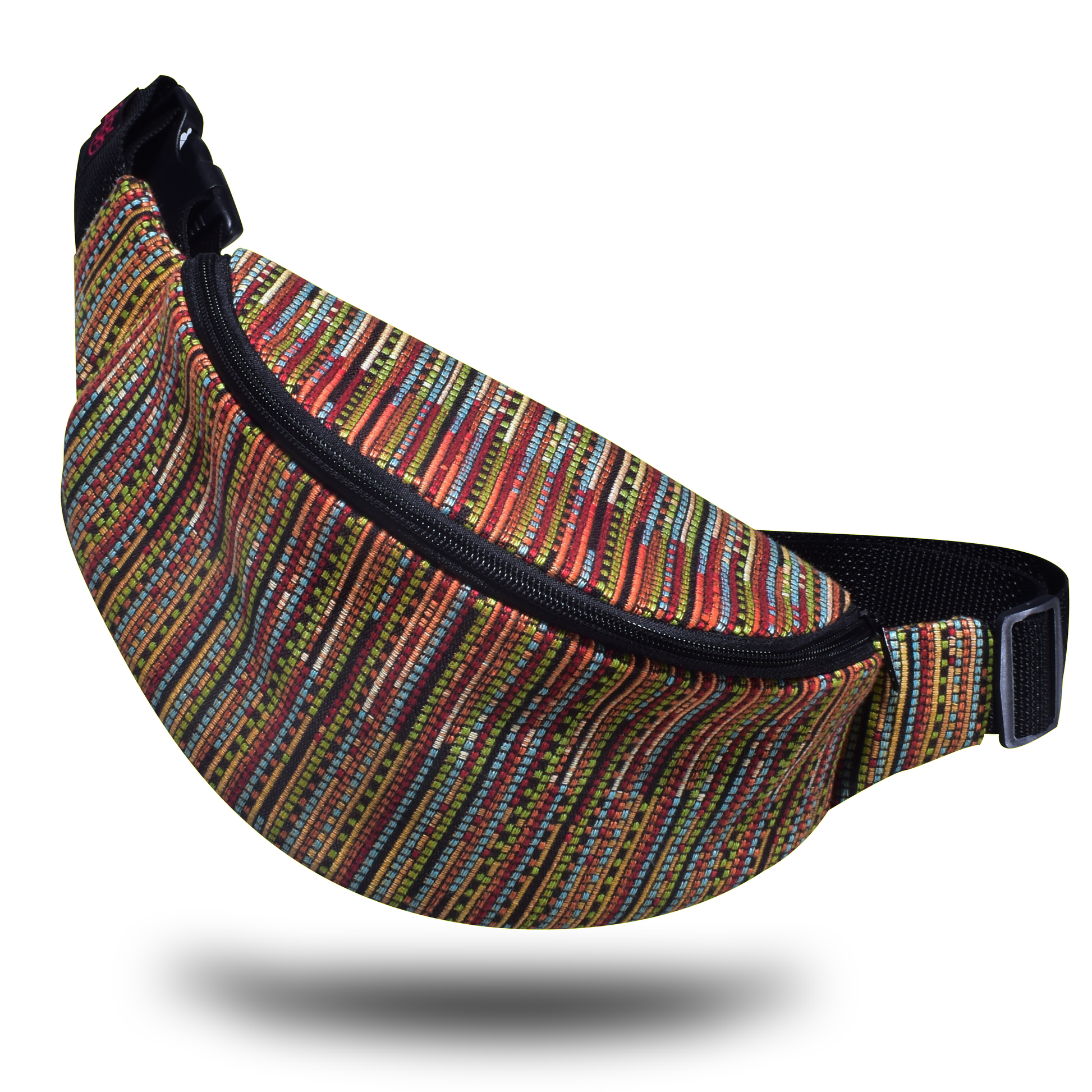 ¡Vibrante y listo para la calle! Esta JASH no es cualquier Fanny: está hecho con una tela fuerte que parece sacada de una pintura tribal psicodélica. Su diseño lleno de rayas diminutas en tonos rojo, naranja, azul, verde y más le da much energía.