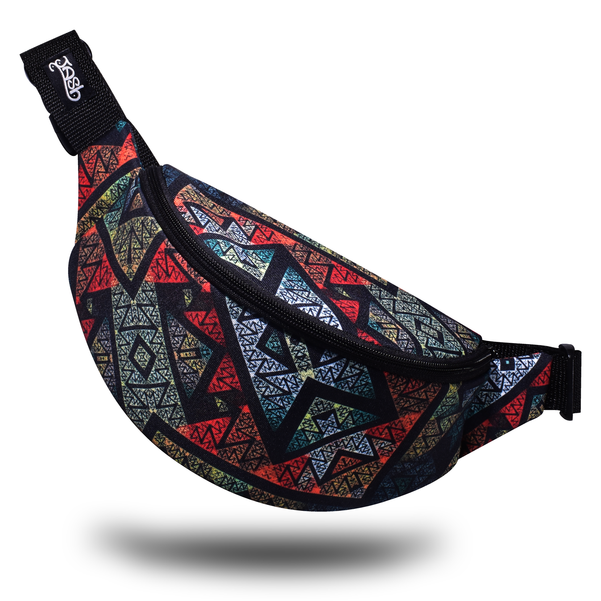 Este no es un fanny pack cualquiera. Es una explosión de color y actitud. Su estampado tribal geométrico mezcla tonos rojos, azules, verdes y dorados que gritan "mírame", sin perder el flow elegante.