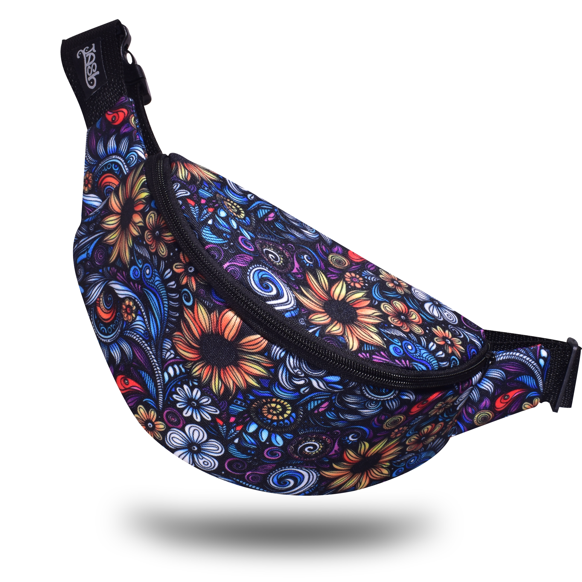 Este Fanny pack de JASH es una fiesta psicodélica de flores sobre fondo negro, donde los girasoles se mezclan con espirales galácticos y detalles botánicos en colores vibrantes. Perfecto para quienes quieren cargar lo esencial sin pasar desapercibidx.