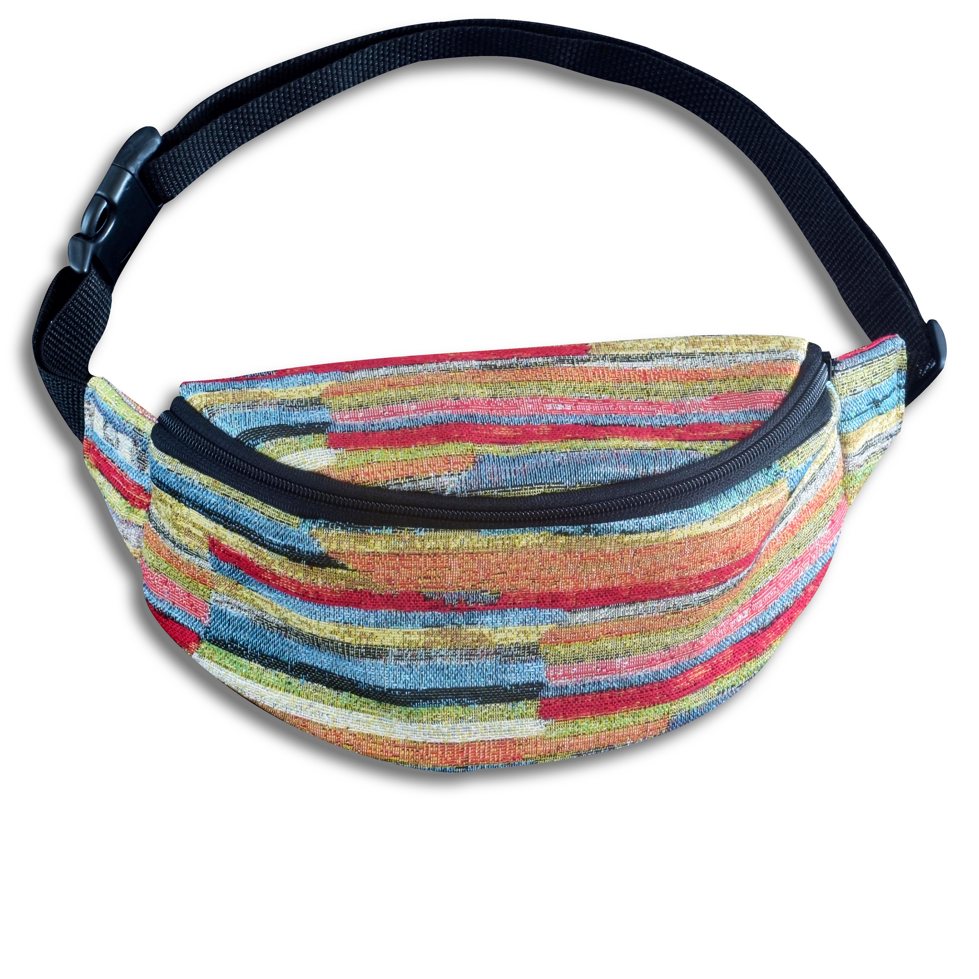 Hecha con tela de tapicería premium texturizada y forro impermeable, tiene un bolsillo interior secreto y correa ajustable.