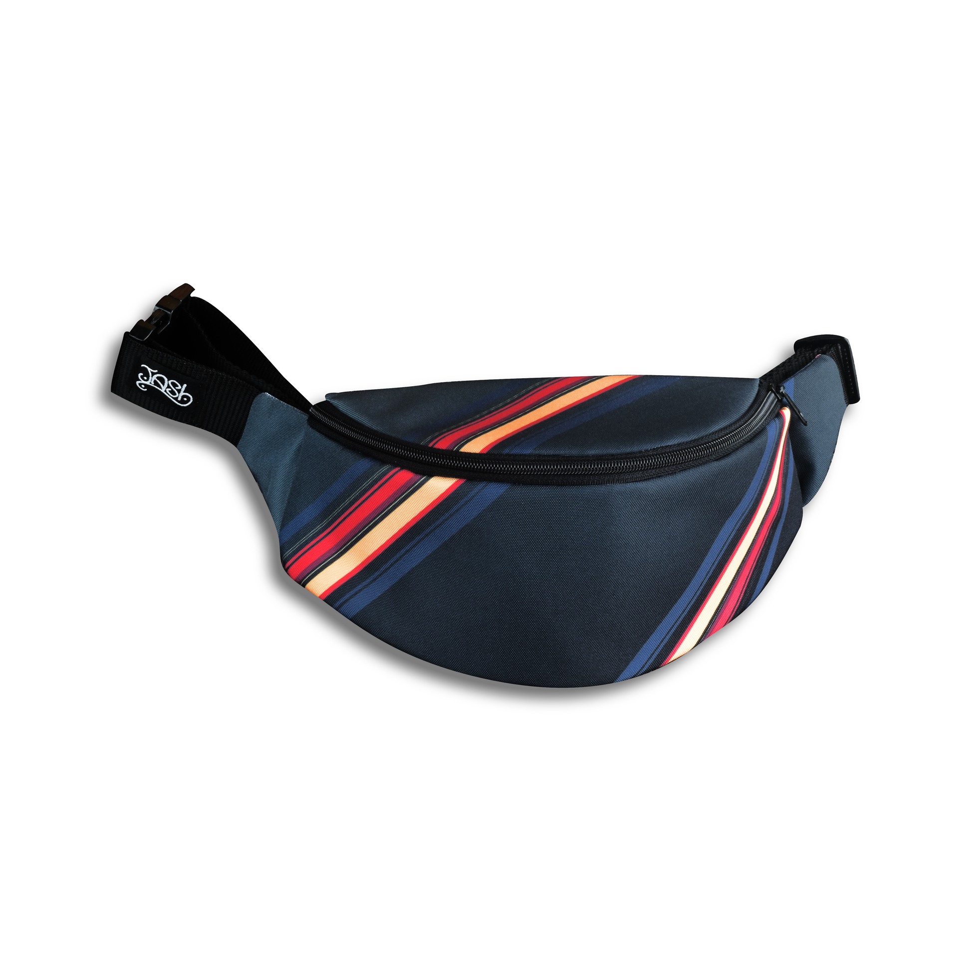 Esta JASH mezcla lo retro con lo calle, lo práctico con lo brutal. Confeccionado con tela poliéster resistente y subliminada con rayas diagonales en tonos rojo, mostaza y azul sobre una base oscura tipo navy, este diseño le mete flow sin gritar.