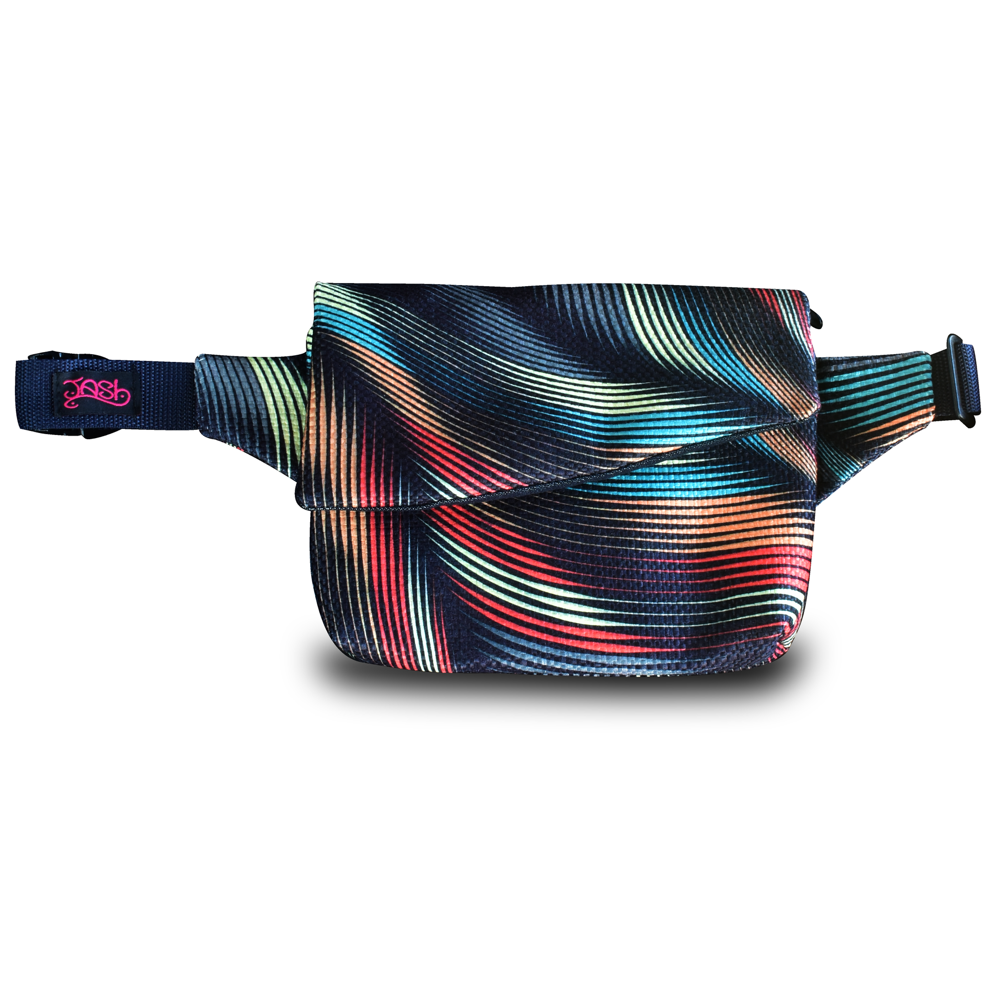 Esta JASH es una galaxia enrollada a tu cintura. El modelo “Órbita” de JASH te lleva de lo urbano a lo cósmico con su estampado hipnótico de líneas curvas multicolor sobre fondo oscuro, como si un rayo de neón hubiera decidido bailar sobre tela.