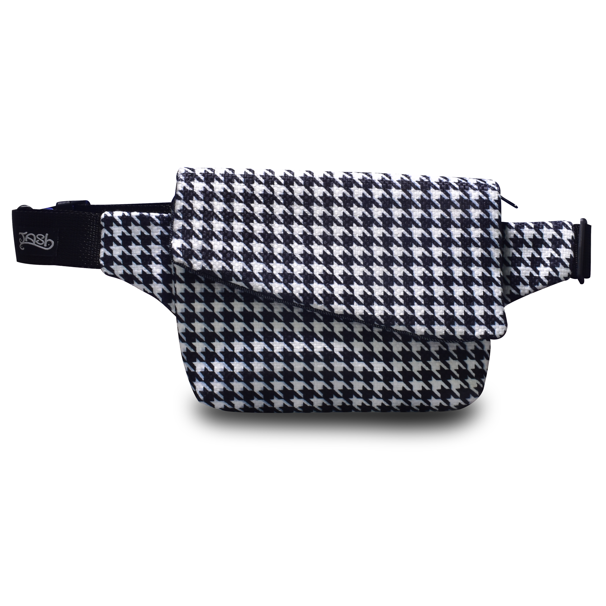Un diseño que captura la elegancia de lo clásico y la transforma en movimiento. El patrón houndstooth no pasa de moda, y en este Fanny, cobra nueva vida. Confeccionado en Puerto Rico con precisión y cariño, guarda lo que necesitas y acompaña cada paso con estilo.